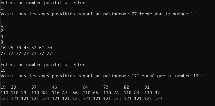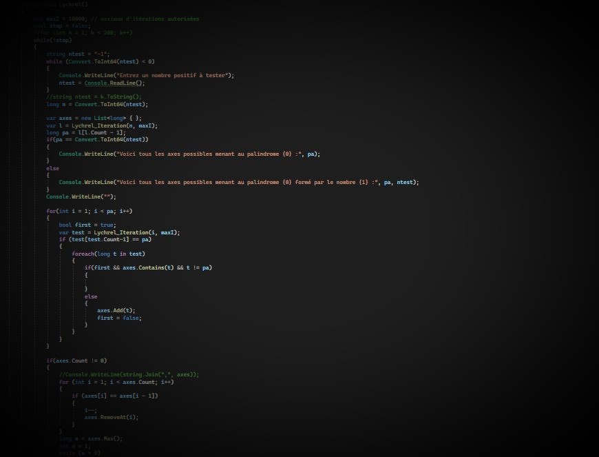 Un programme qui me tient à cœur explorant les itérations de Lychrel, consistant en l’addition répétée d’un nombre avec ce même nombre lu dans l’autre sens jusqu’à donner un palindrome, un nombre se lisant dans les deux sens. J’ai codé un programme pour effectuer ces itérations sur un nombre choisi et de montrer les étapes menant au premier palindrome formé, le cas échéant. Certains nombres, appelés nombres de Lychrel, ne produiraient jamais de palindrome, même après des millions d’itérations, néanmoins on n’a encore prouver l’existence d’aucun d’entre eux. Si vous voulez en comprendre davantage sur cette conjecture, je vous redirige vers sa page Wikipedia.