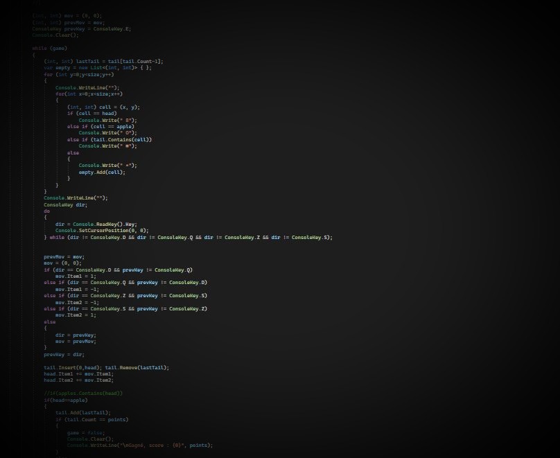 Voici un petit snake sur console, un peu ridicule car sur Visual Studio lorsqu’une touche est attendue, le programme s’arrête, donc le snake n’a aucun intérêt à être joué, mais ce fut malgré tout un bon exercice à coder rapidement.