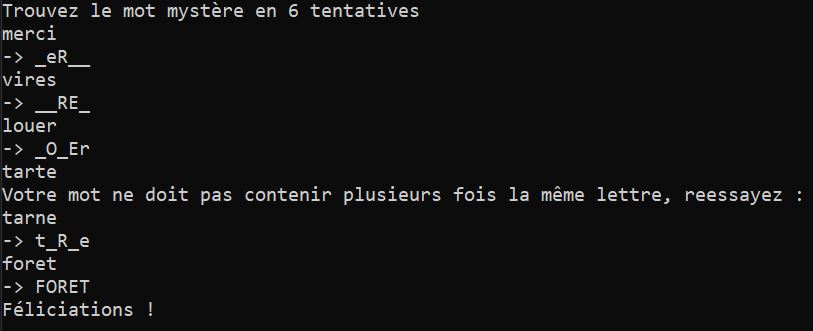 Le premier programme que j’ai codé sur Visual Studio où à l’époque, le jeu Wordaily était très connu. Il s’agit de retrouver un mot en quelques tentatives, et à chacune d’entre elles, on a des indications sur si des lettres sont bien placées, ou encore si le mot mystère contient ces dernières mais dans un autre ordre. Sur mon code, une lettre bien placée est en majuscule, tandis qu’une lettre présente dans le mot mais mal placée est en miniscule.